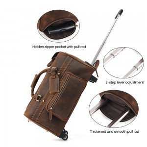 Kwuo nke ọma na nsogbu nke ibu ibu dị arọ ma nabata ịdị mma na ụdị nke ezigbo akpa trolley akpụkpọ anụ. Ma ị na-eme njem n'ọdụ ụgbọ elu ndị na-eme mkpọtụ ma ọ bụ na-eme njem n'okporo ụzọ obodo, akpa njem a na-ebugharị ebugharị maka ụmụ nwoke bụ ihe atụ nke okomoko bara uru. Bulite ahụmịhe njem gị na akpa trolley a ọkaibe yana arụ ọrụ, wee kwupụta nkwupụta ebe ọ bụla ihe omume gị na-ewega gị.